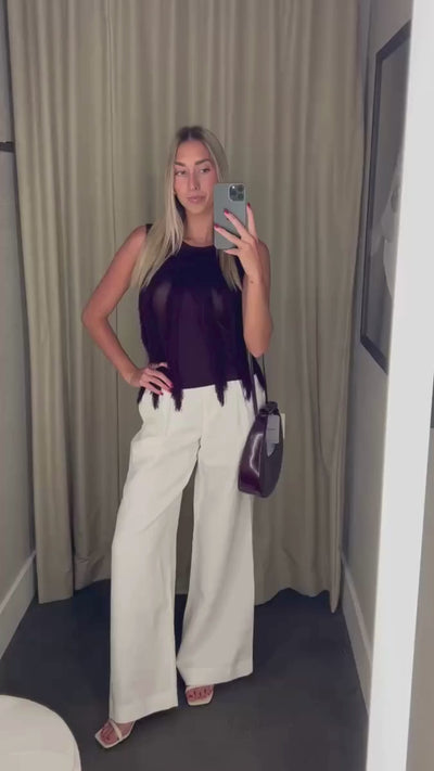The Ulla Johnson Bonnie Knit Top in Mahogany features a sophisticated slim fit with a crew neckline and sleeveless design. Its standout detail is the layered macrame fringe embellishment, adding texture and elegance. Crafted from a blend of viscose, nylon, and polyamide, this slip-on top offers both comfort and style for a refined look.